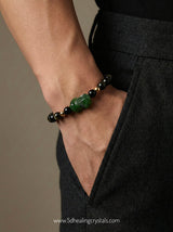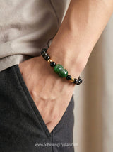 This bracelet features a finely carved Jade Pi Yao as its centerpiece, paired with polished Gold Sheen Obsidian beads for a powerful yet understated design that suits everyday wear.