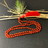 The mala may coil on the floor with the hand resting on the right knee or used with the hand concealed in the Mala Bag.