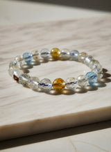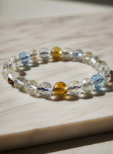 Illuminate your aura with the vibrant energy of the Multicolored Topaz Bracelet, a stunning fusion of golden, blue, and clear hues that shimmer with light and positivity. Each faceted bead captures the essence of joy, clarity, and confidence — blending the uplifting warmth of Golden Topaz with the serene calm of Blue Topaz and the pure brilliance of Clear Topaz.