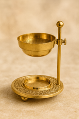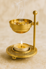 Elevate your sacred rituals with this beautifully handcrafted brass resin incense burner, designed for both elegance and functionality. The piece features a finely detailed base with floral engravings, supporting an adjustable mesh cup that holds resins securely. A tea light candle rests beneath, gently heating the resins without the need for charcoal, creating a clean and long-lasting aromatic experience.