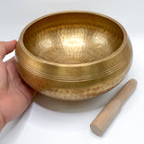 Using the Mallet: Gently strike the bowl to create a sound, then run the mallet around the bowl’s rim to maintain the tone. This sound can help focus the mind and deepen meditation.